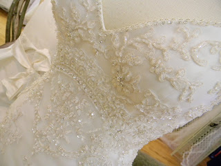 Stunning beaded detail on a wedding gown by Casablanca Bridal at September's Bride in downtown Holland. September's Bride is filled with wedding dresses for every style of bride - from a tea-length vintage dress to a beaded tulle gown. Stop in NOW to see their Sidewalk Sale Rack! A lucky bride just got a dress for $19 yesterday!